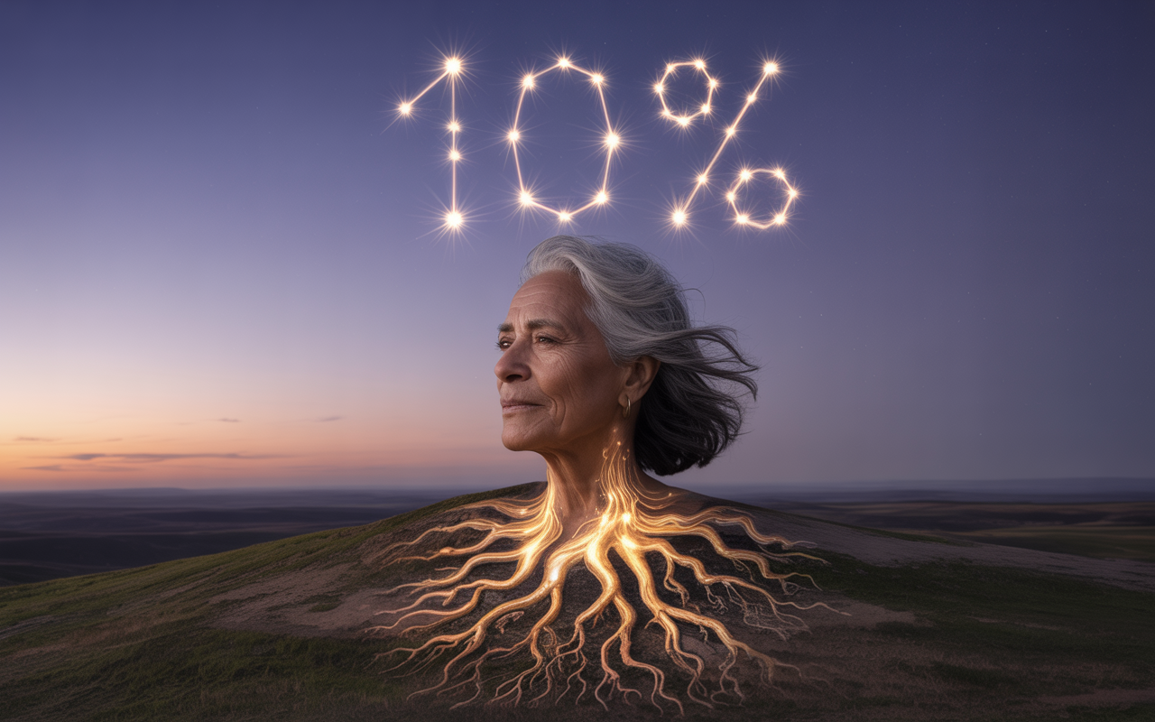 She stands at the edge of evening, an older woman in her 60s, silhouetted against a sky that is not quite night and not quite day. Her feet are firmly planted on the hilltop, but the image reveals what the naked eye usually cannot see: powerful roots stretching down into the earth, spreading, branching, anchoring. Above her, a constellation comes into focus, stars slowly aligning into the quiet but unmistakable shape of “10%.” Each point of light represents an elder over 50 who has chosen a different way of living this season of life—conscious, connected, and fiercely alive.